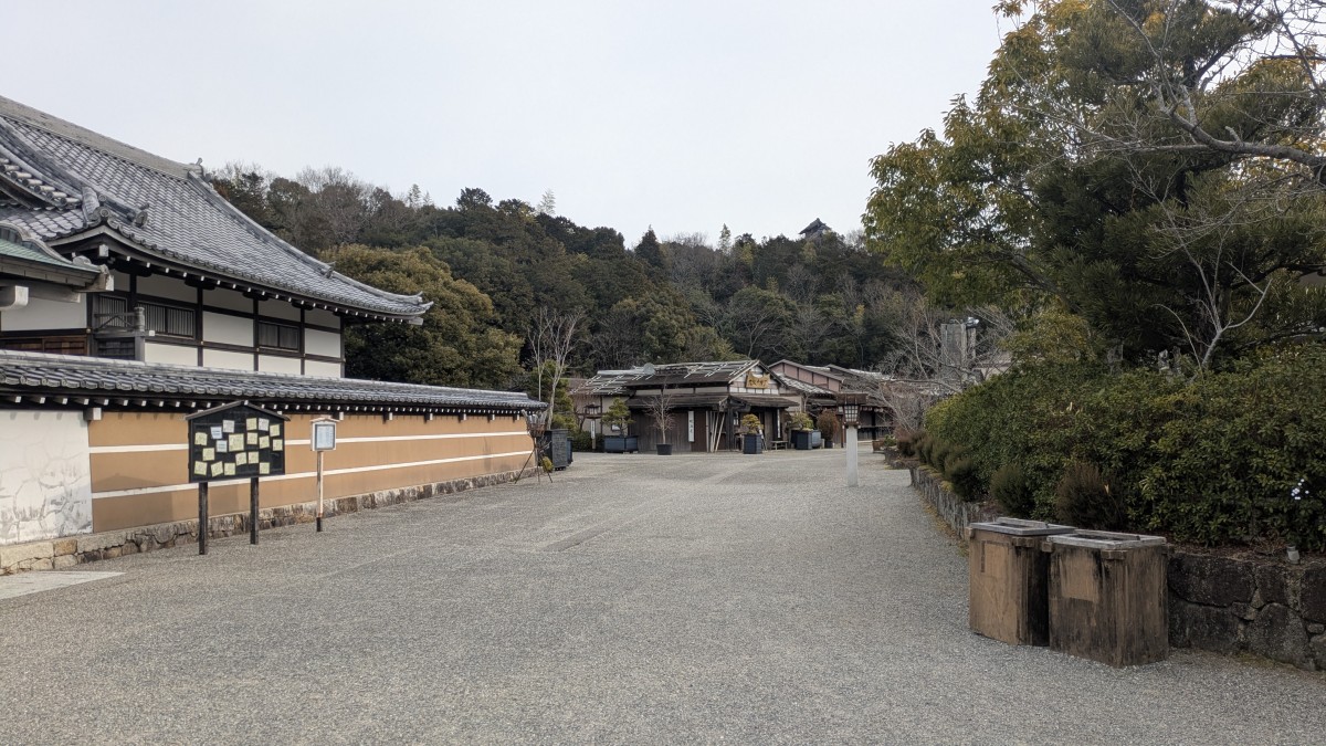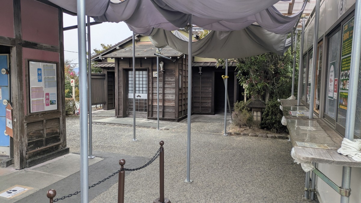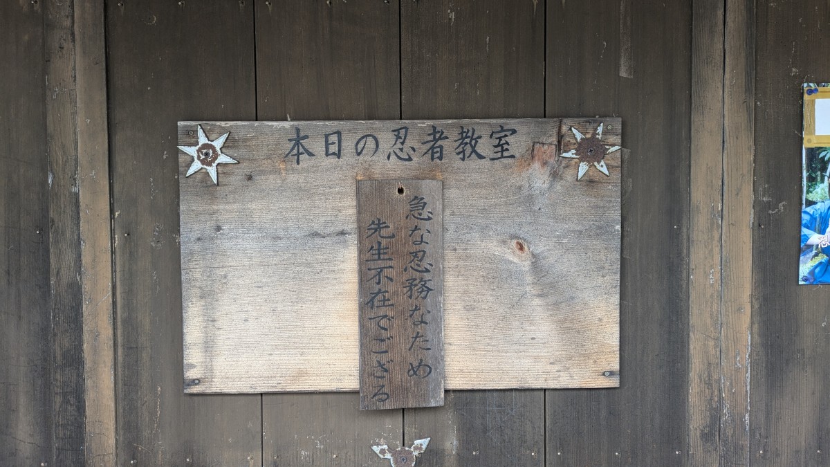 入口には「安土城下の湯は2025年7月より閉館しております」と書かれた注意書きがある。チケット購入時には、忍者キングダムの目玉施設である、安土城を復元した建物は改装中で外観しか見られないと説明があった。以前来たときは入浴施設はまだ営業中だったが、ちょうどシリーズ成田の分配が止まって大きく騒ぎになった時期と前後して閉館したらしい。閉館の理由も書かれていない。