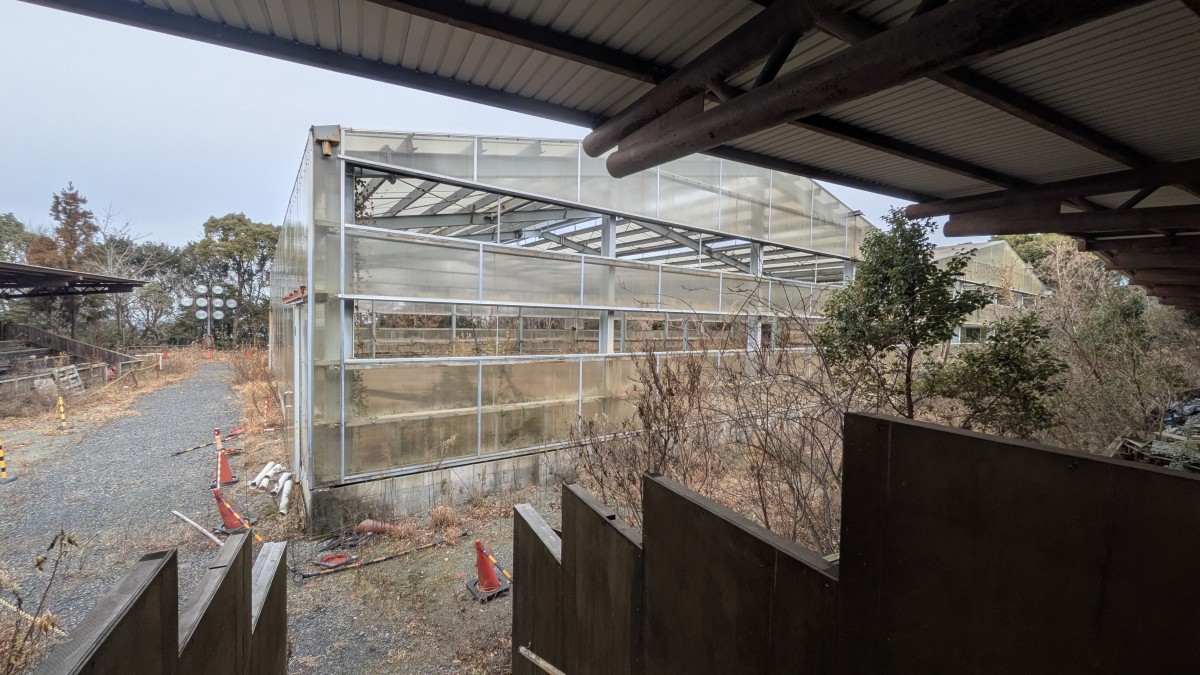 そんな安土城の脇に、朽ち果てた屋外劇場のようなものがある。案内図にも何も書かれておらず、観客席も腐り果てて雑木まで生えている有様なので、相当長い期間使用していない模様だが、その中に、バナナの栽培を行っていたらしき温室の残骸が残されている。もちろんすでに荒れ果てていて今は何も製造していないが、同じ三重県内にあったバナナの製造拠点の温室と構造はまったく同じである。