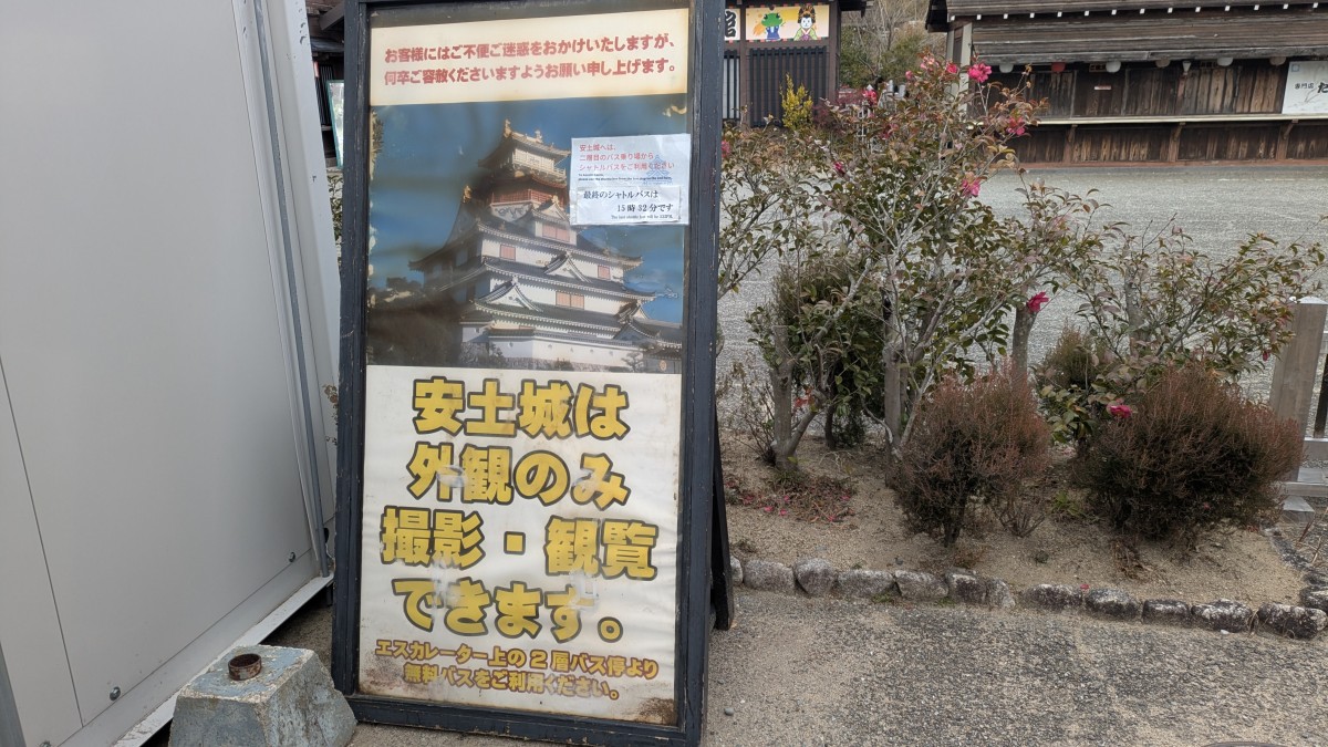 スタッフは、いくつかのアトラクションで待機している若いスタッフがいる他は、営業中の2軒の土産物店にそれぞれ店番が各一人、山頂付近にある安土城へ向かう送迎バスの運転手が一人、入口のチケット売りの女性が一人、園内を掃除している女性が一人がいて、僕が見かけた範囲ではスタッフの数は合計で8名であった。誇張ではなく本当に客よりスタッフの方が多い。入場したはよいけれどこれといってやることがないので、早速目玉である安土城を見に行こうと思い、送迎バスの乗り場へ向かうことにした。