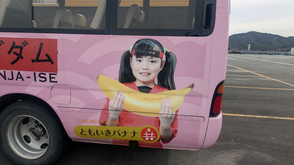 乗り場で待機するバスの車体には、忍者の衣装を着た女の子が大きなバナナを手にする写真がペイントされている。その下には「ともいきバナナ」とあり、共生バンクのロゴも描かれている。「奇跡のバナナ」を投資商品とする共生バンクが、この施設でバナナを強くアピールするのは今に始まった話ではないが、それを体験型テーマパークにストレートに持ち込む姿勢はまったく理解できない。