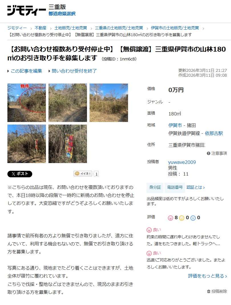 2026年3月11日に「ジモティーで山林を売る【0円】」の動画を公開し、それと連動して、以前取材協力者の方より無償で引き取った三重県伊賀市の山林を実際にジモティーで出品した。